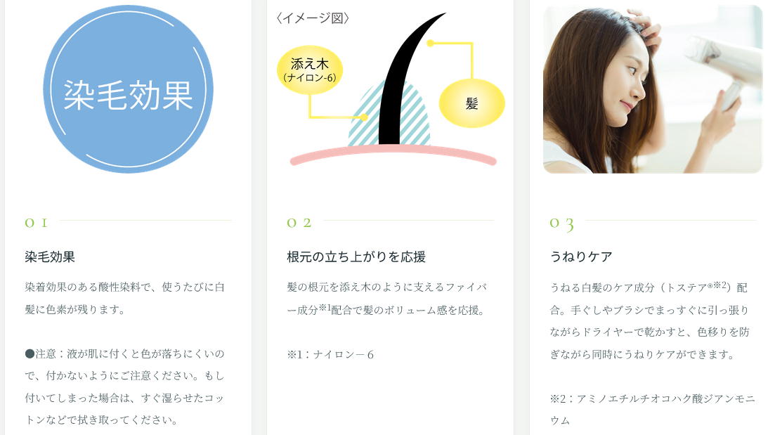 シャンプーしても、少しづつ色が残っていきますので、生えてくる白髪も目立ちにくくなります。